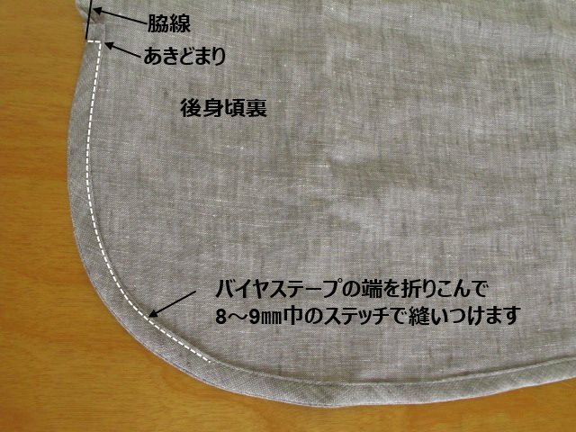 バイヤステープを指定寸法の輪にして、接ぎ目を袖底に合わせて、