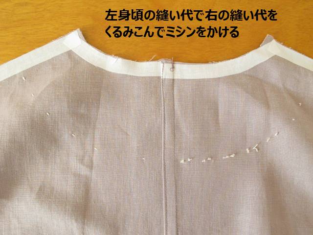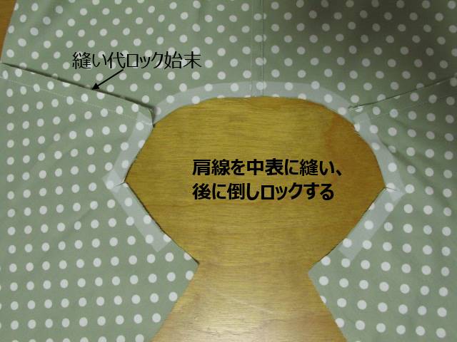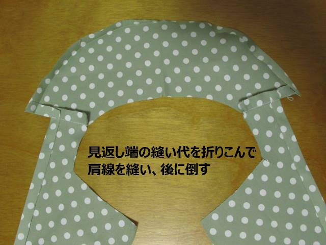 前後見返しを肩線で中表に縫い合わせ、後に縫い代を倒します