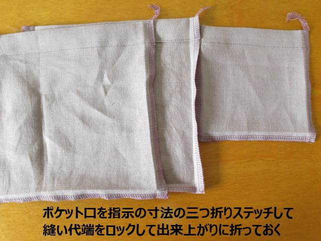 それぞれのポケットを出来上がりの形にアイロンで整えておきます