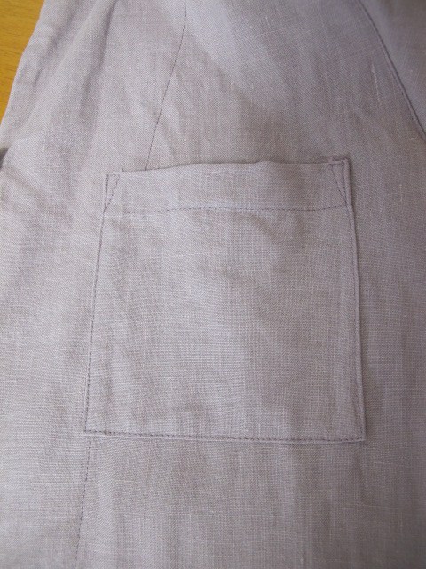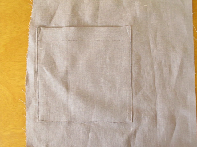 左胸ポケットを前身頃に縫いつけます。ポケット口の端は三角にステッチをします