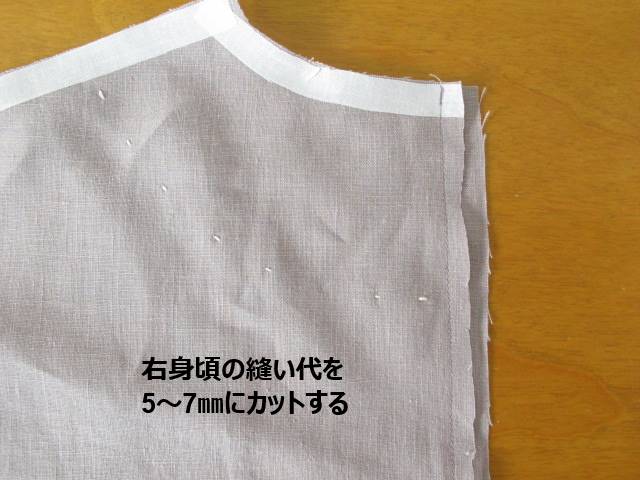 後中心を中表に縫い合わせ、右側の縫い代を6~7mmにカットして、