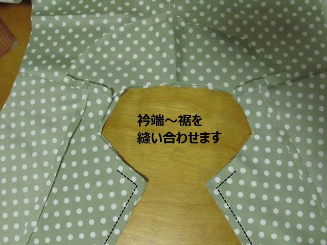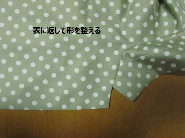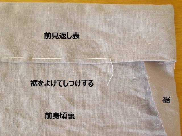 表に返して形を整え、前後見返し端を身頃にしつけます
