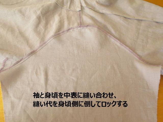 身頃の袖ぐりと袖を中表に縫い合わせ、縫い代を身頃側に倒して、