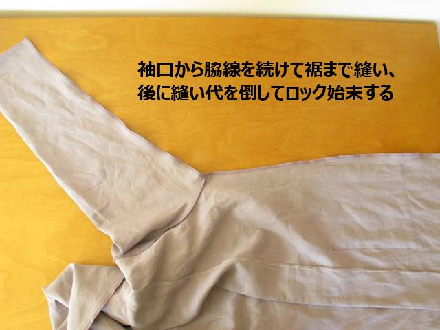 袖下~脇線を続けて中表に縫い合わせ、縫い代を後に倒してロックします